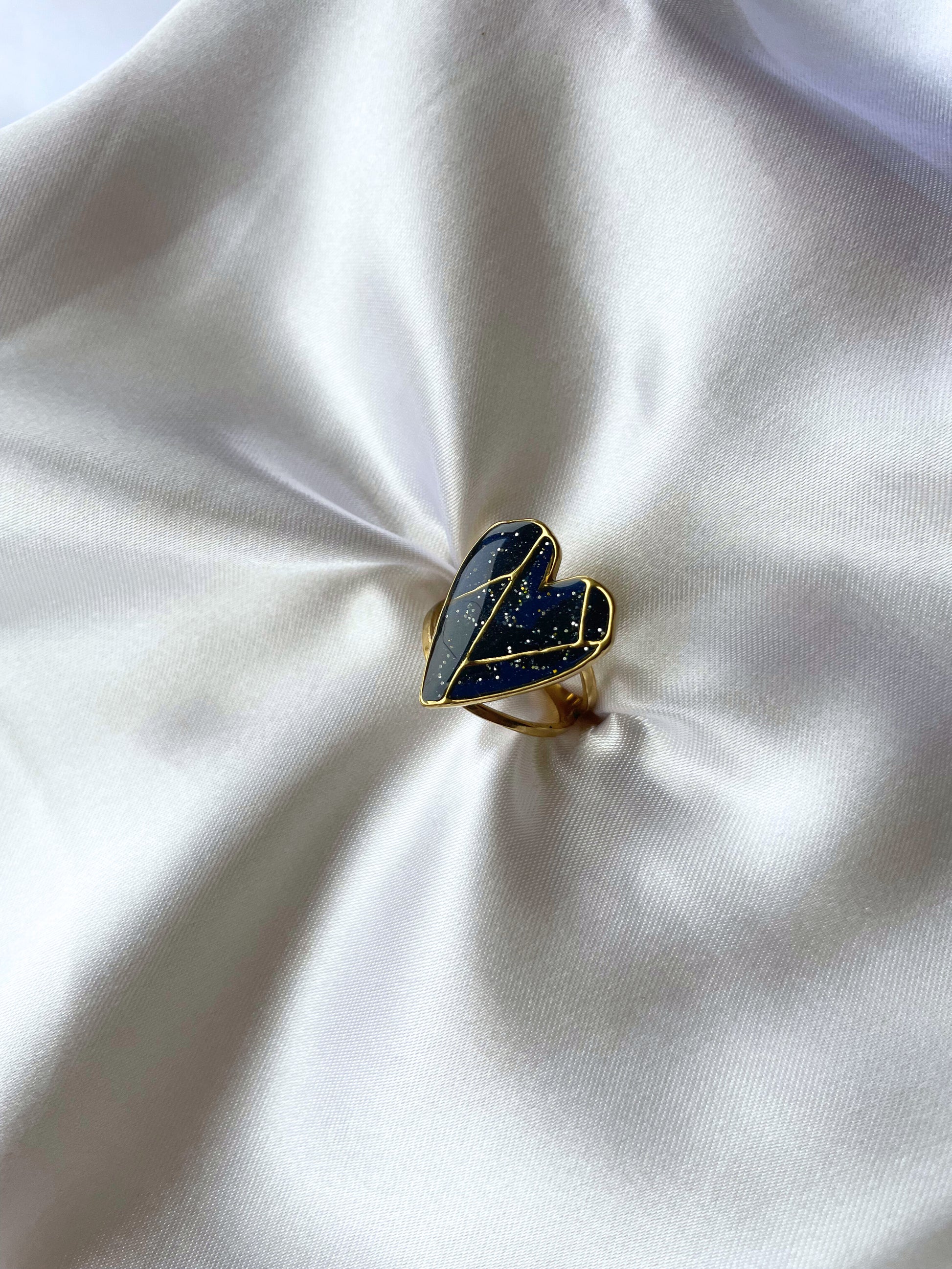 O anel em formato coração Geo é ajustável e é feito em aço inoxidável banhado a ouro 14k.