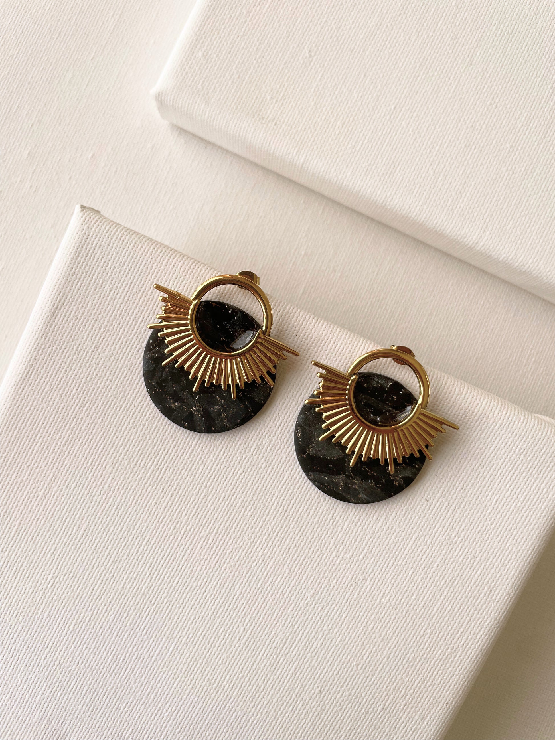 Os brincos Cairo são feitos em aço inoxidável e argila de polímero.