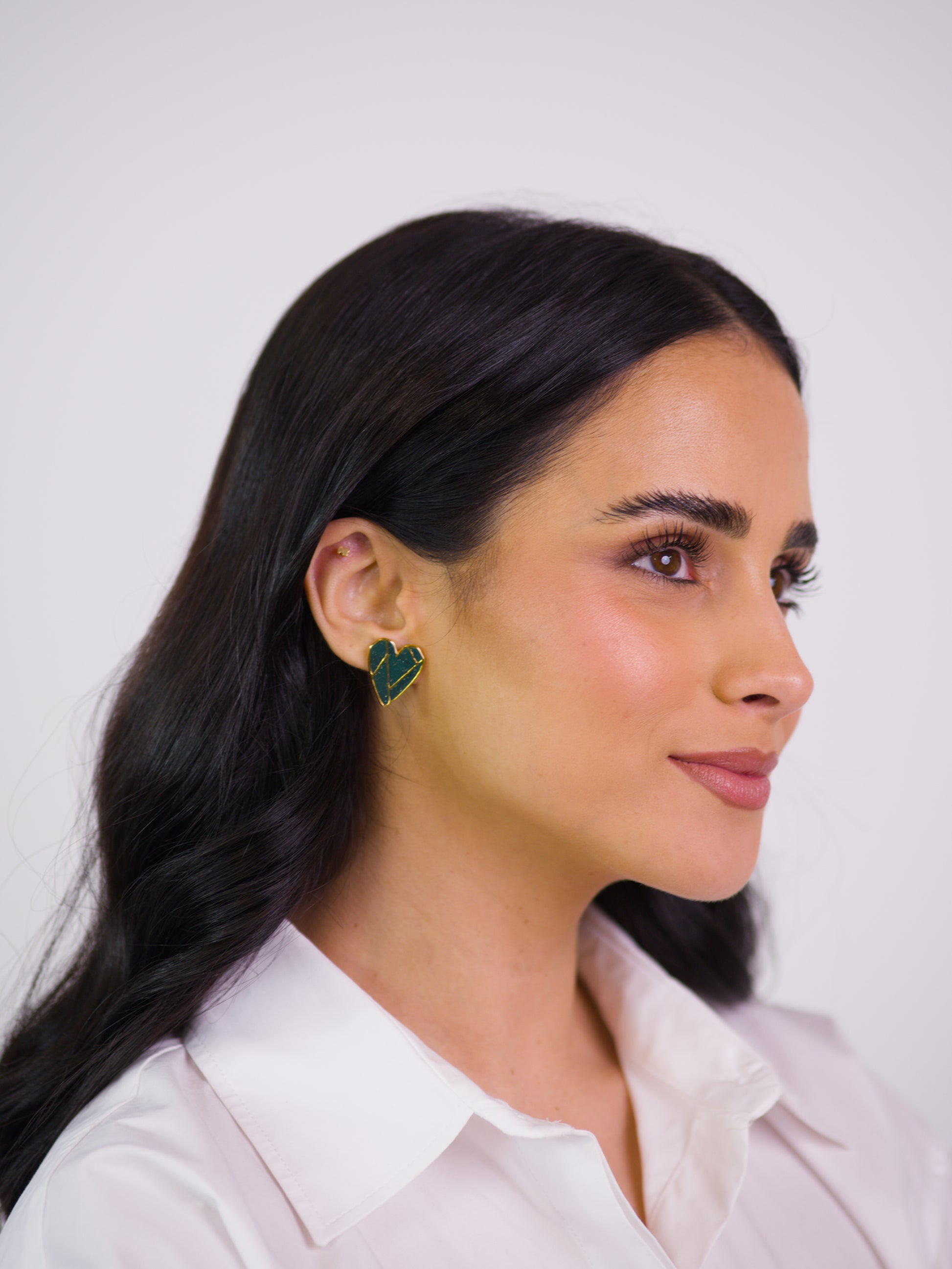 Brincos em formato de coração, feitos em aço inoxidável e argila de polímero com acabamento em resina.