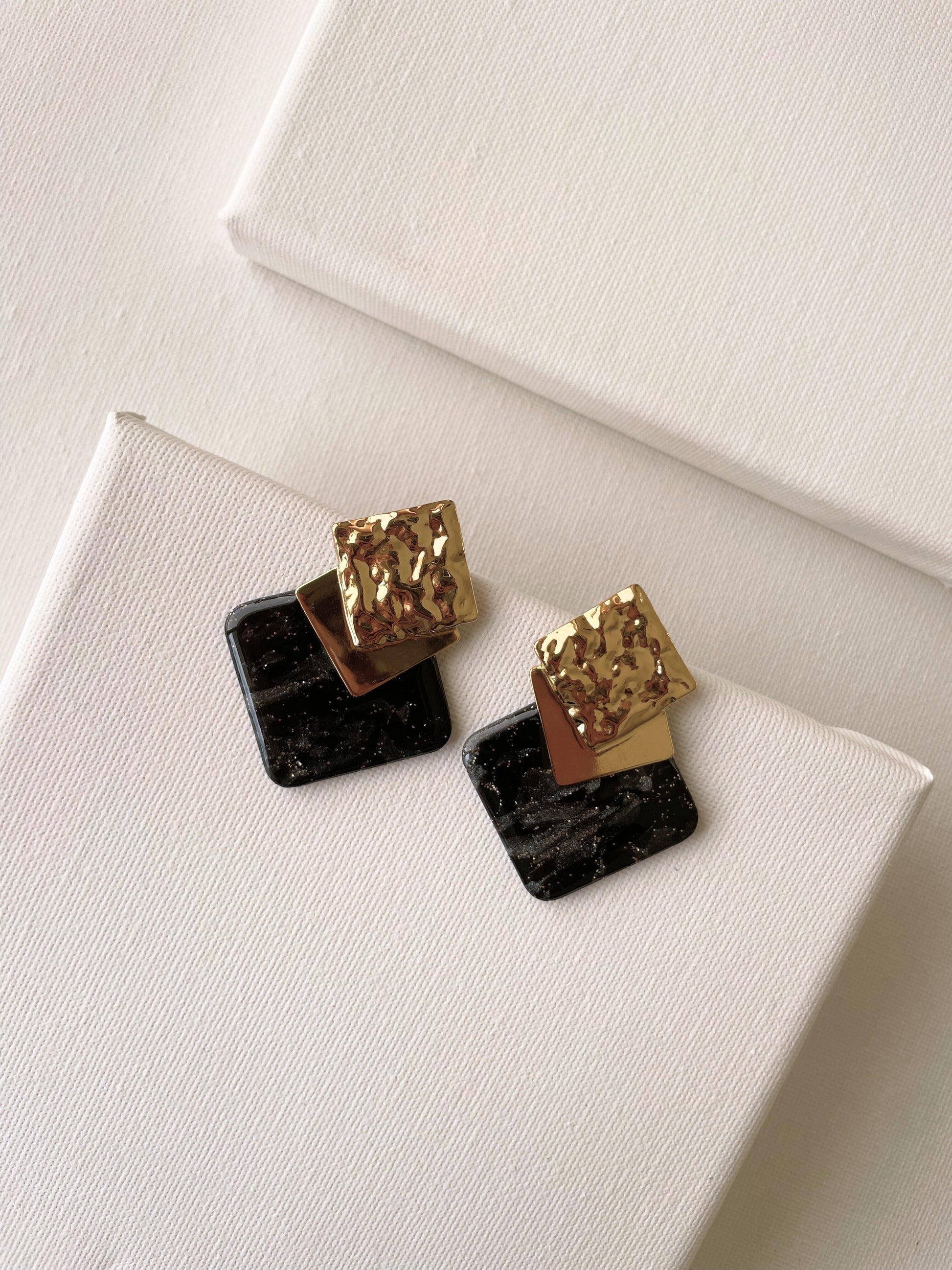 Os brincos Holly são feitos em aço inoxidável e argila de polímero.
