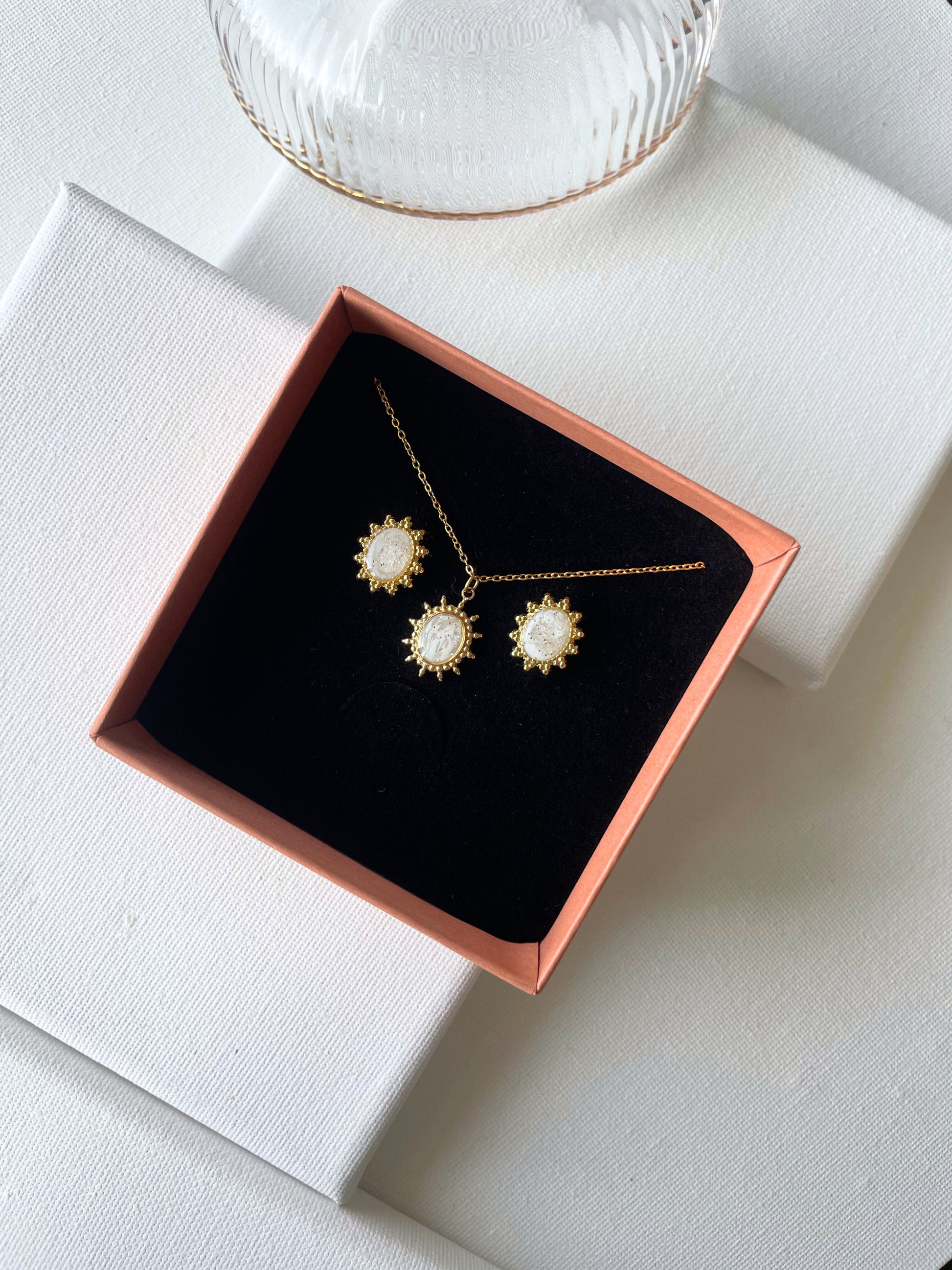 de brincos e colar em aço inoxidável, personalizado em argila de polímero.