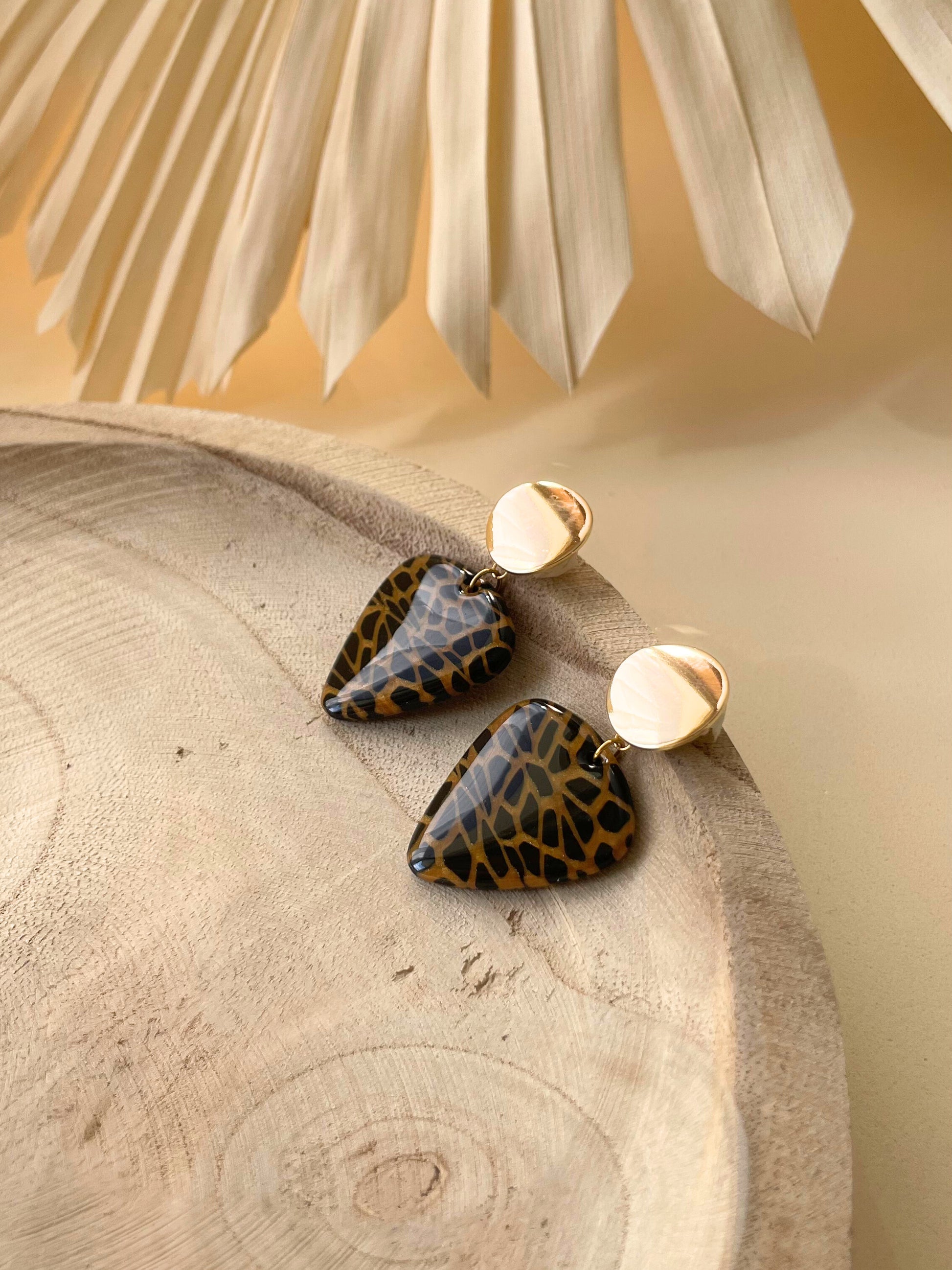 Os brincos London são feitos em latão banhado a ouro, argila de polímero e acabamento em resina.