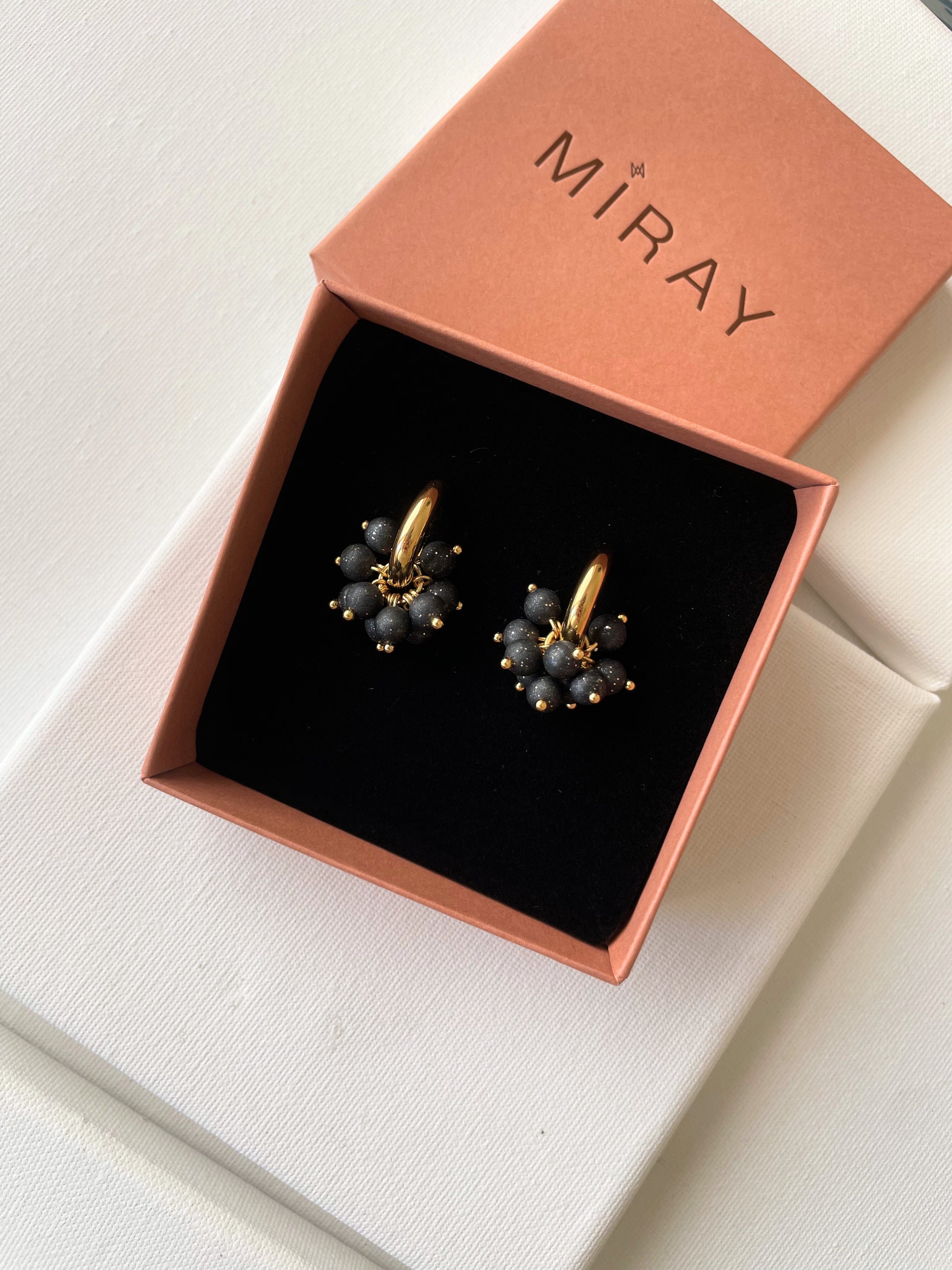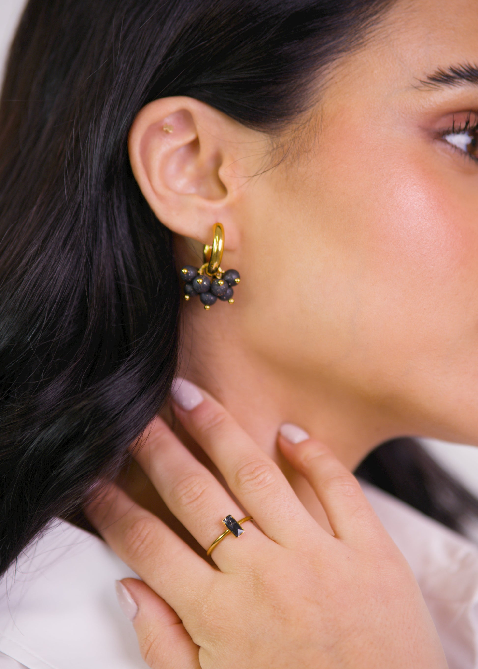 A base metálica é feita em Gold Filled 18k e as pérolas são feitas em argila.